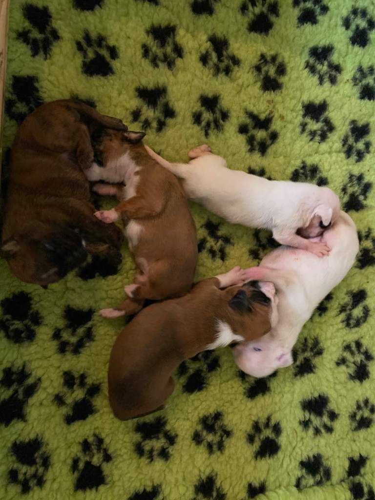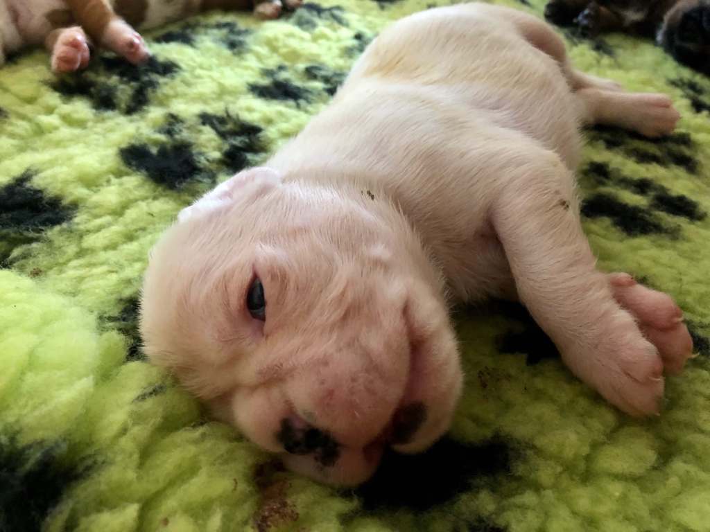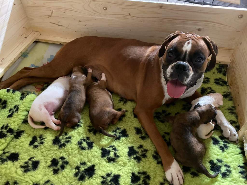 22. September 2019: Die ersten Bilder unserer zuckersüßen Boxerwelpen. Die kleinen Welpen sind nun 7 Tage alt, haben größtenteils die Augen noch zu und schlafen und saufen sehr viel. Die ersten „Gehversuche“ finden in der Wurfbox statt, aber natürlich sind die Welpen noch viel zu klein um aufrecht zu stehen. Boxer Mutter Arya begleitet die Welpen hervorragend, ist entspannt und produziert genug Milch!