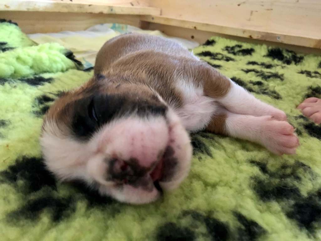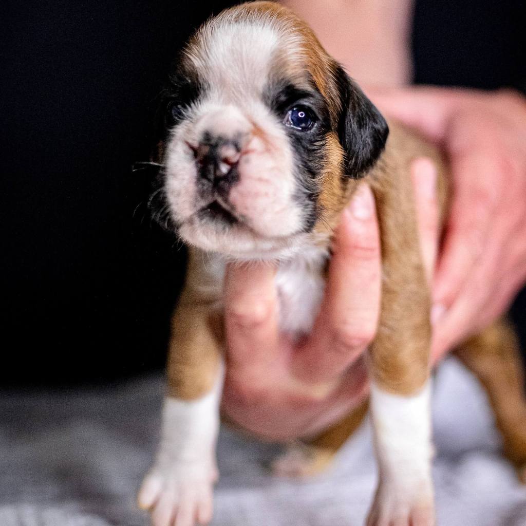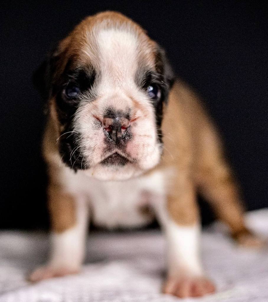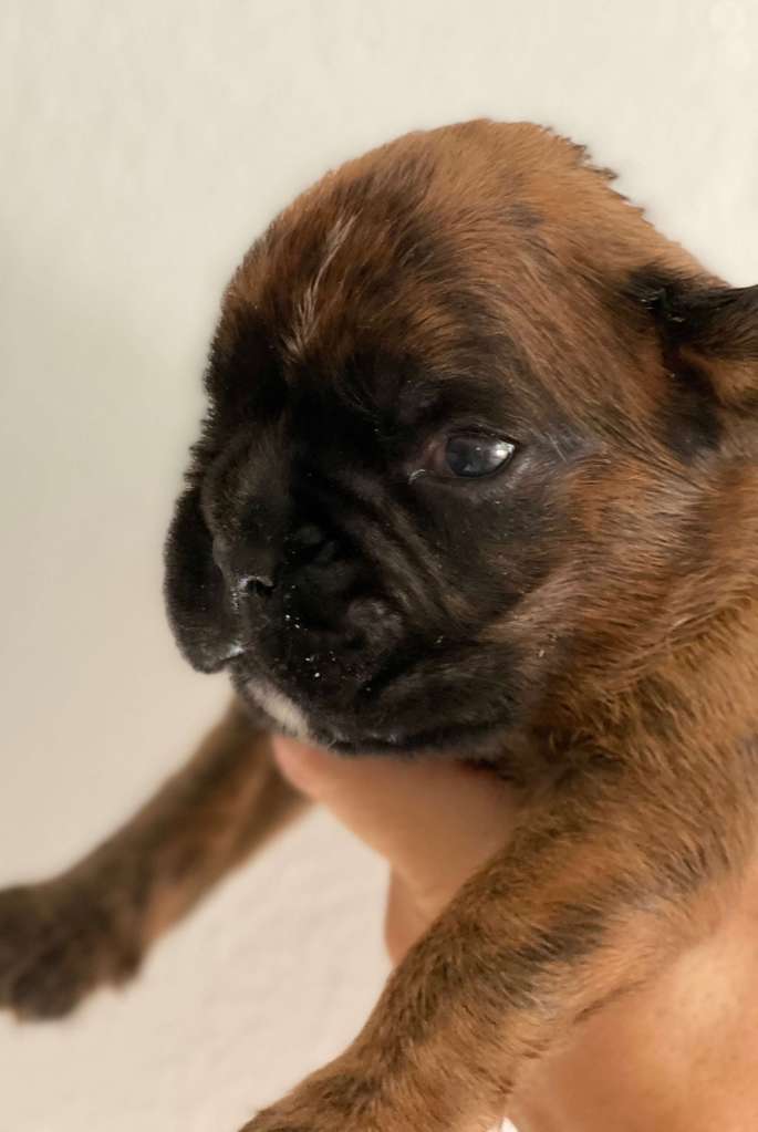 30. September 2019: Heute ist es soweit, vier der fünf Boxerwelpen haben die Augen geöffnet! Unser Welpe „Amboss“ unternimmt die ersten Gehversuche und stellt sich schon ganz gut an. Die Welpen haben nun ein Gewicht von 1000 – 1300 Gramm, sie saufen hervorragend und legen somit die Grundlage für ein gesundes Leben.