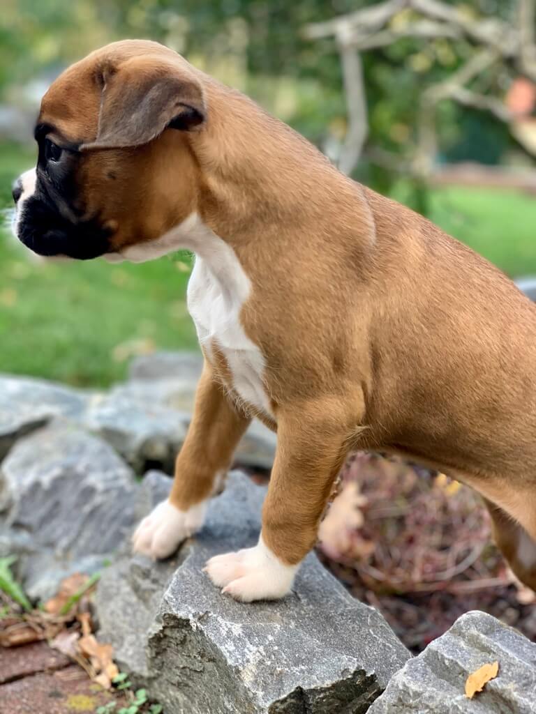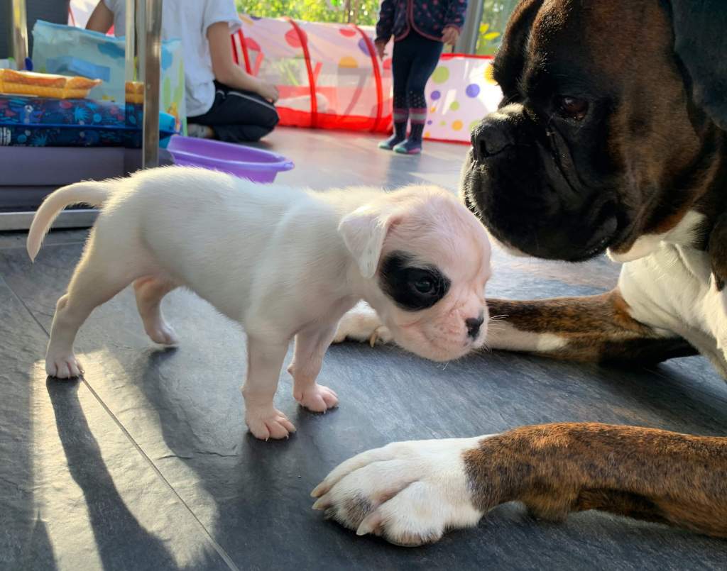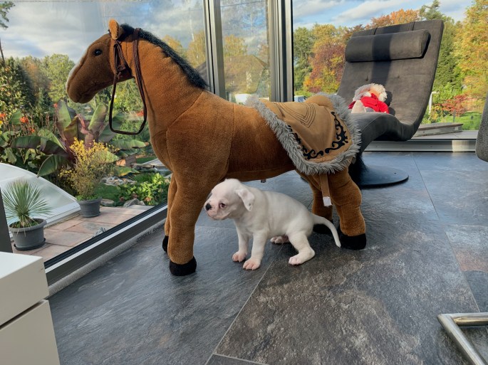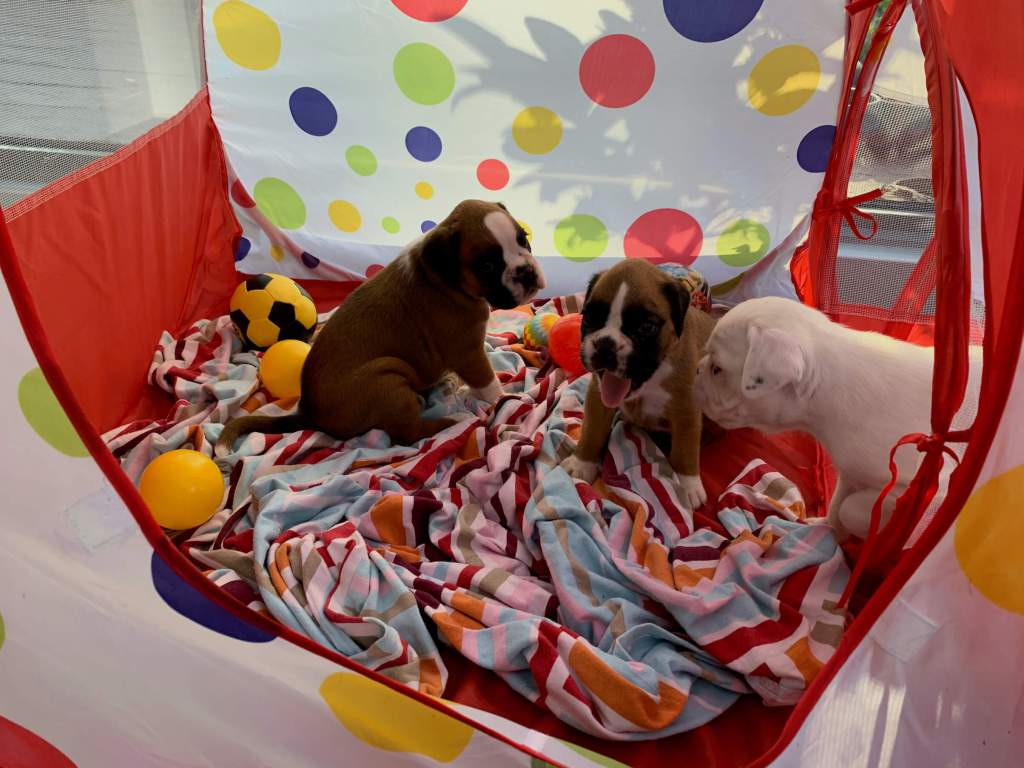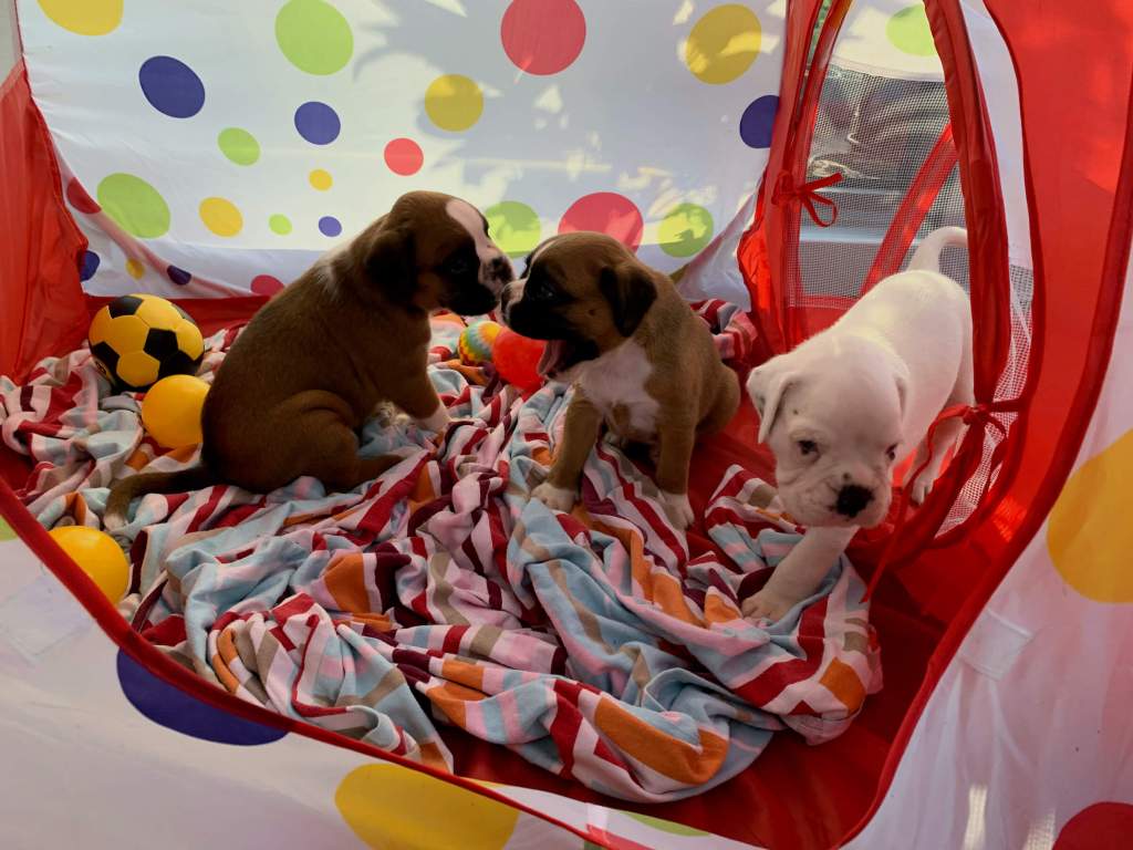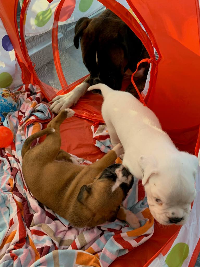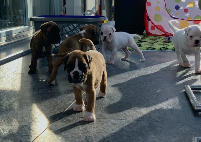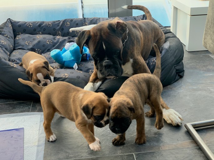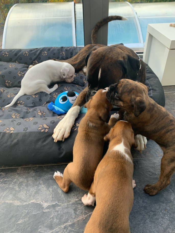 13. Oktober 2019: Sonne, 25 Grad im Oktober, herrlichstes Wetter und dazu unsere wunderschönen Boxerwelpen. Heute ging es das erste Mal raus aus dem Wurfraum-Raum, rein in unser Familienleben im Wintergarten. Die Kleinen haben es genossen, mit Mama und Papa gespielt und gekuschelt. Es wurde sich gesonnt, herumgetobt, sich gegenseitig gebissen. Ein Traum den kleinen so zuzuschauen.