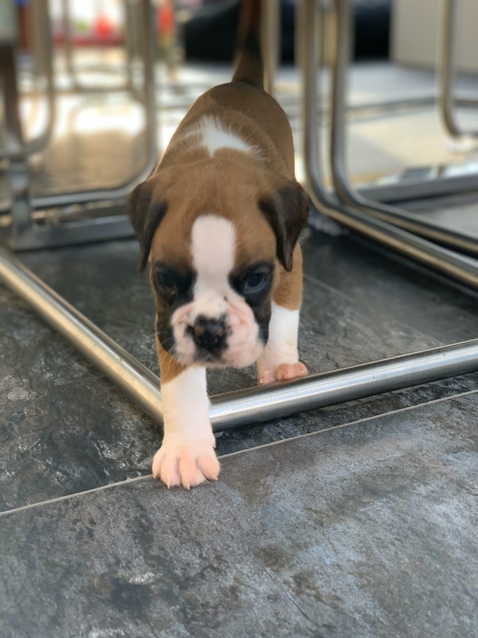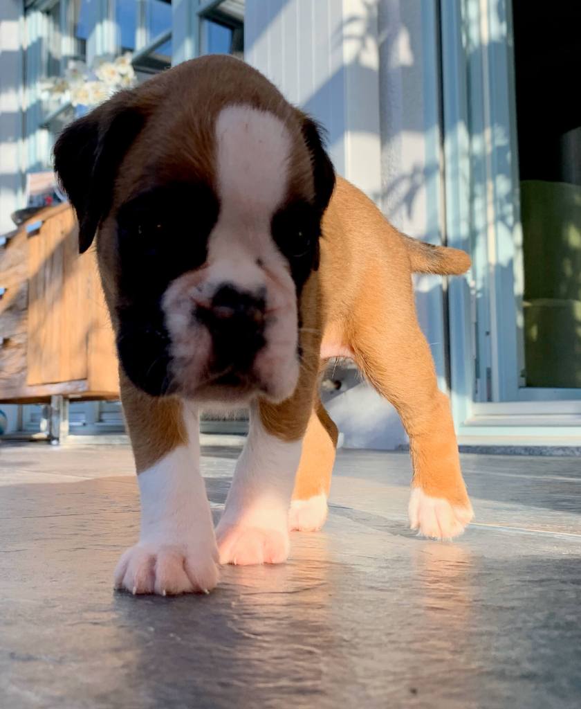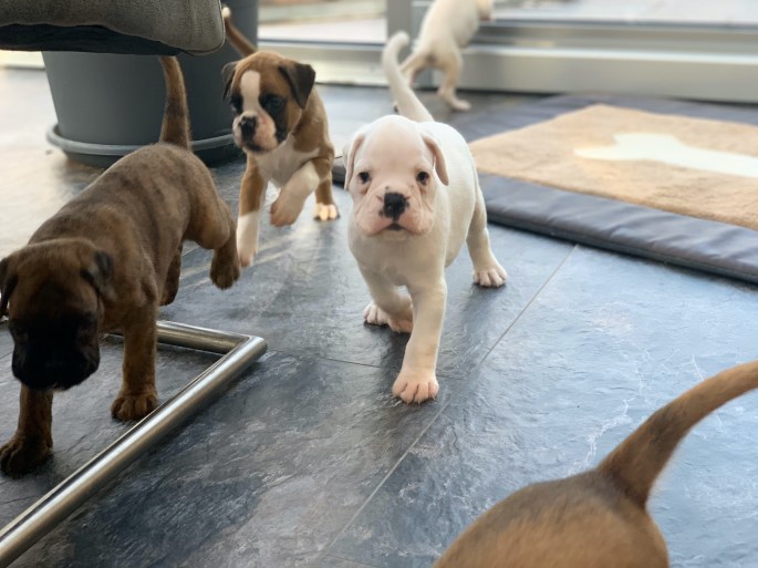 8. Oktober 2019: Der Fotograf war da und hat tausende schöne Bilder von den zuckersüßen Boxerwelpen gemacht. Die kleinen laufen seit 5 Tagen, tollen herum und fangen miteinander an zu spielen. Jede Minute eine Freude! Die erste Entwurmung haben alle bestens überstanden. Nun wird das Wetter wieder schön und die kleinen können das erste Mal an die frische Luft!