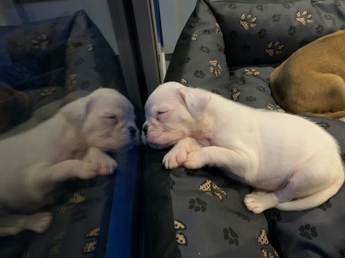 20. Oktober 2019: Heute sind wir fünf Wochen alt geworden. Endlich können wir auch mit unsere Papa spielen, der sich immer so schön ärgern lässt. Und wenn wir damit fertig sind, fallen wir Boxerwelpen in unser Kuschelbett und ruhen uns aus.